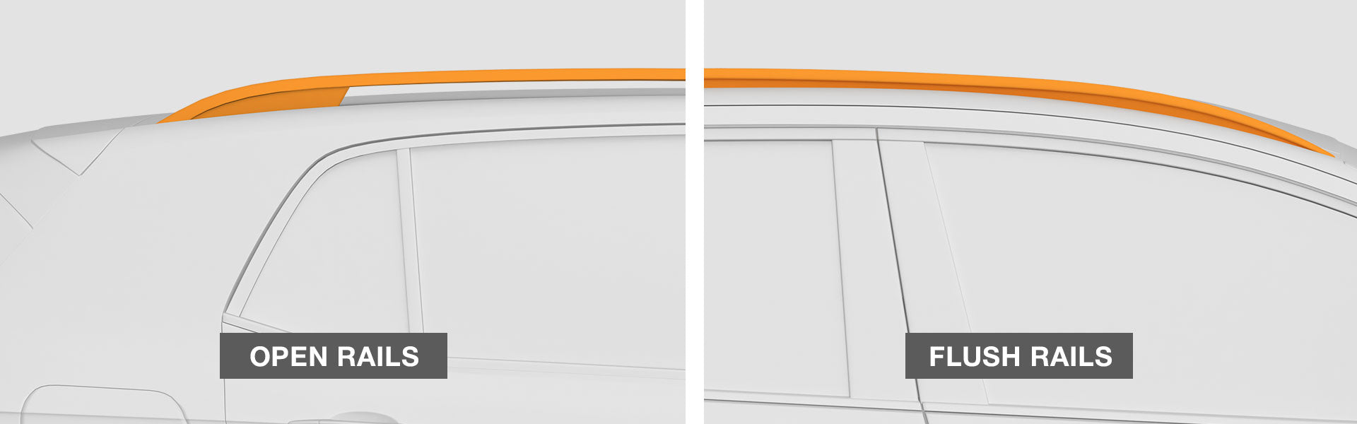 Open and flush rails refers to the type of rails on your car which the roof bars are mounted onto. Open rails have a gap between the rail and the roof, while flush rails sit directly on the roof with no gap